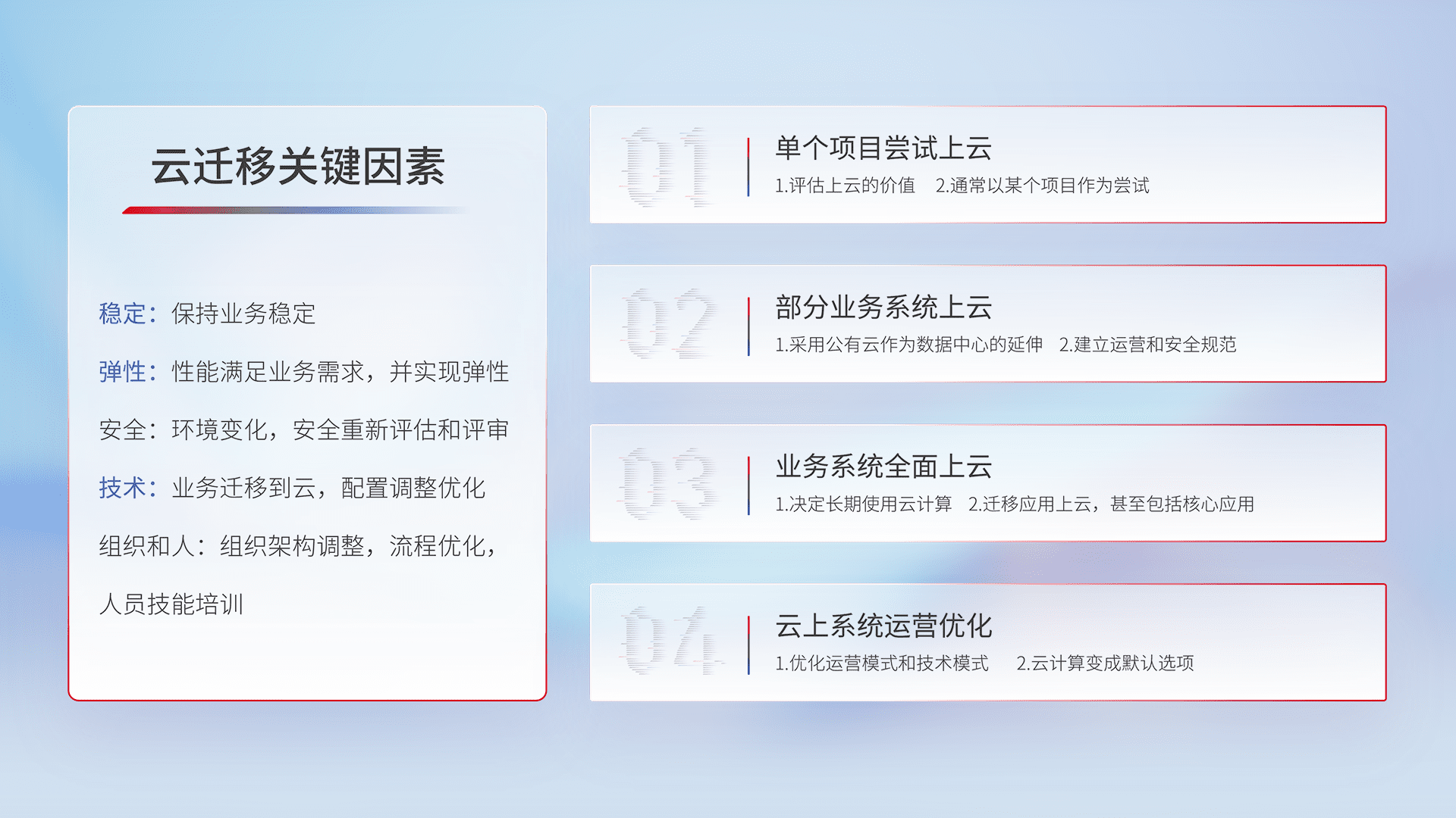结合实际业务,,,从规划设计、、、、云平台选型、、、云原生改造、、数据迁移、、、、集成交付,,迁移全过程为客户识别最佳上云路径,,,做好风险识别管理,,,设计网络架构、、、、身份权限、、、安全审计合规、、、操作审计、、、日志审计、、、、监控告警策略、、、多站点容灾设计等,,对云上基础设施进行整体规划,,,提升IT治理水平,,以满足弹性、、、高可用、、、高性能的需求。。。