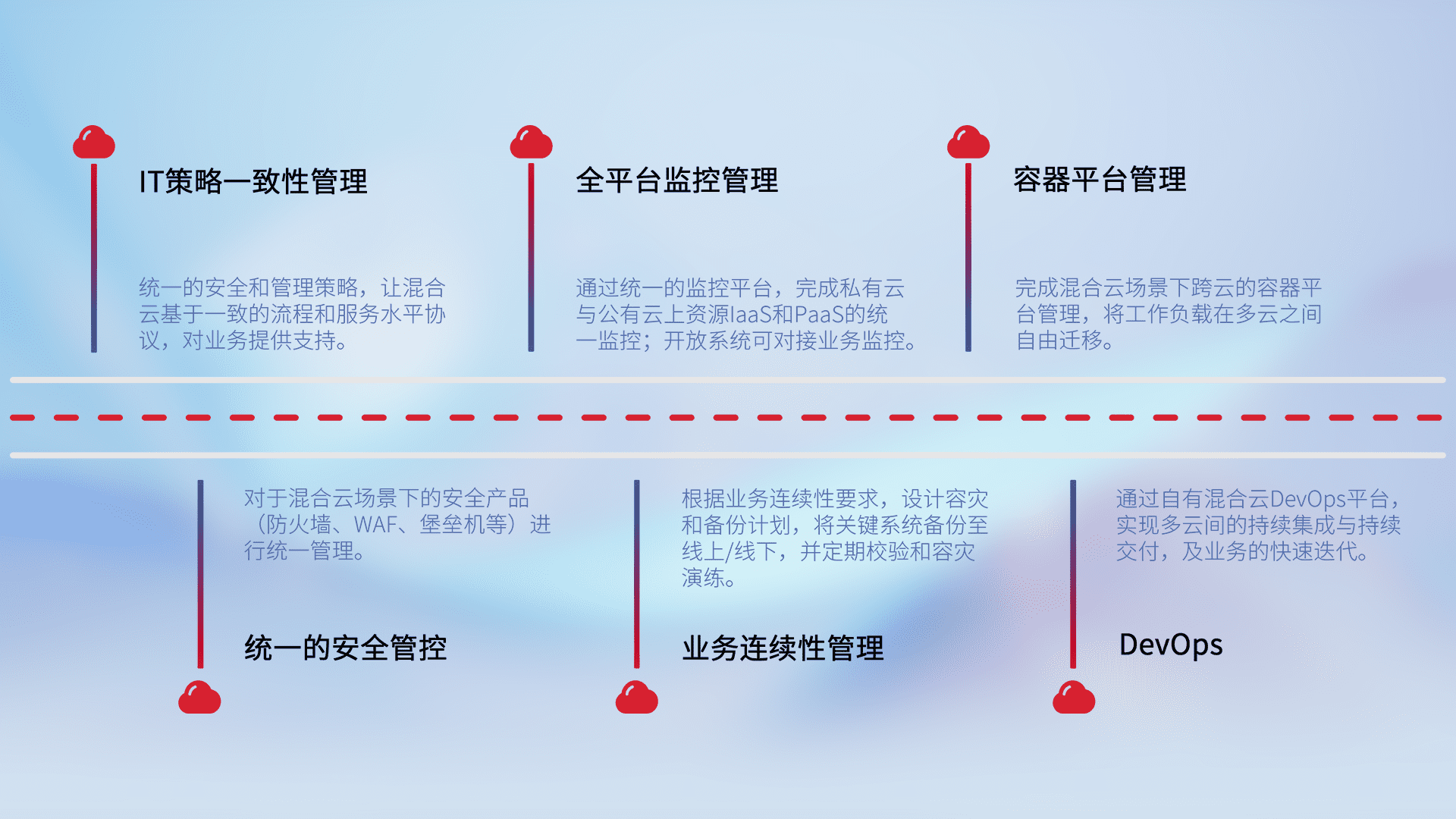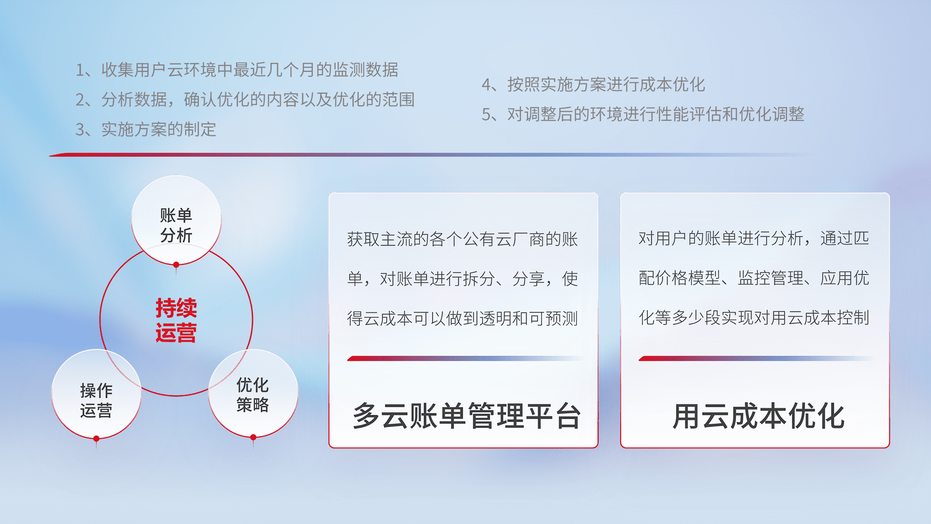 通过多云纳管,,,,以统一的资源数据模型把客户的云资源进行抽象和封装,,进而实现对多云资源的统一操作,,保障云资源管理的可靠性、、、、稳定性与可用性。。。量身定制化运维内容,,,配置、、、、开发运维、、、补丁管理、、、备份、、、监控、、、认证和访问管理、、、、审计和日常巡检等,,,保障在用云过程中的可靠度,,,稳定度以及高可用率。。。。