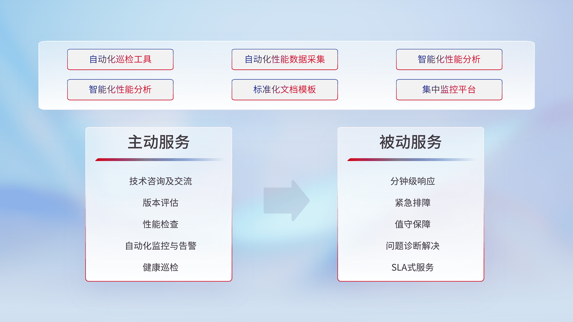 智能化工具和标准化文档,,,,保障服务质量,,提供主动服务(包含技术咨询、、、、版本评估、、、、性能检查、、、、自动化监控与告警、、、、健康巡检)和被动服务包含(分钟级响应、、、紧急排障、、、值守保障、、、、问题诊断解决、、、、SLA服务)。。。。